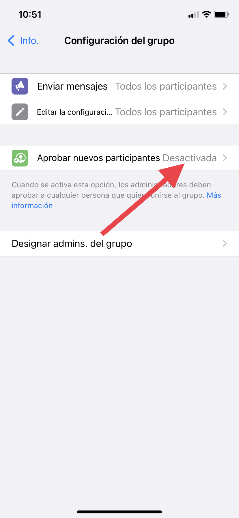 Una vez que pulses sobre esta opción te aparecerá en pantalla la posibilidad de Activar o Desactivar si deseas ser tú quién apruebe a los nuevos integrantes del grupo antes de que estos puedan participar en el mismo. Si lo activas, tendrás que ser quién apruebe a cualquier persona que quiera unirse al mismo, momento a partir del cual recibirás avisos cuando haya nuevas personas que decidan unirse a tu comunidad, y no podrán participar en el grupo ni acceder a sus contenidos hasta que se les haya aprobado el acceso.