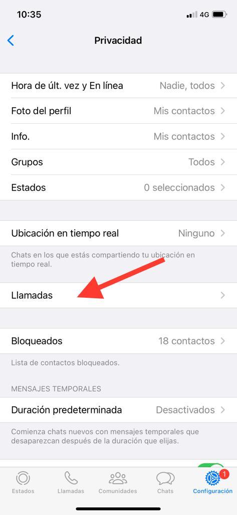 Dentro de las opciones de privacidad vas a tener que bajar hasta llegar al apartado de Llamadas, que encontrarás debajo del listado de chats en los que has compartido tu ubicación en tiempo real.