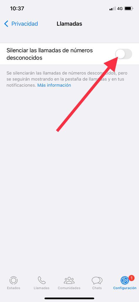 Una vez se ha accedido al apartado Llamadas, te encontrarás con un solo botón que dice «Silenciar las llamadas de números desconocidos» que tendrás que activar para dejar de recibir esas molestas llamadas. Al igual que sucede en el caso de Android, en este caso no escucharás la llamada ni tampoco te vibrará el móvil, pero seguirán mostrándose en las notificaciones y en la pestaña de llamadas