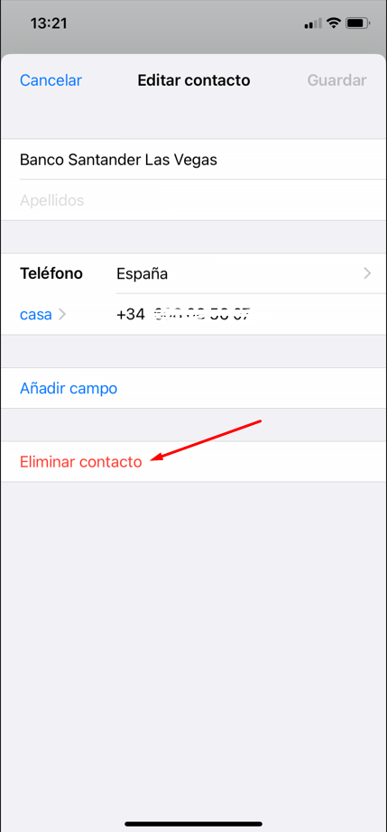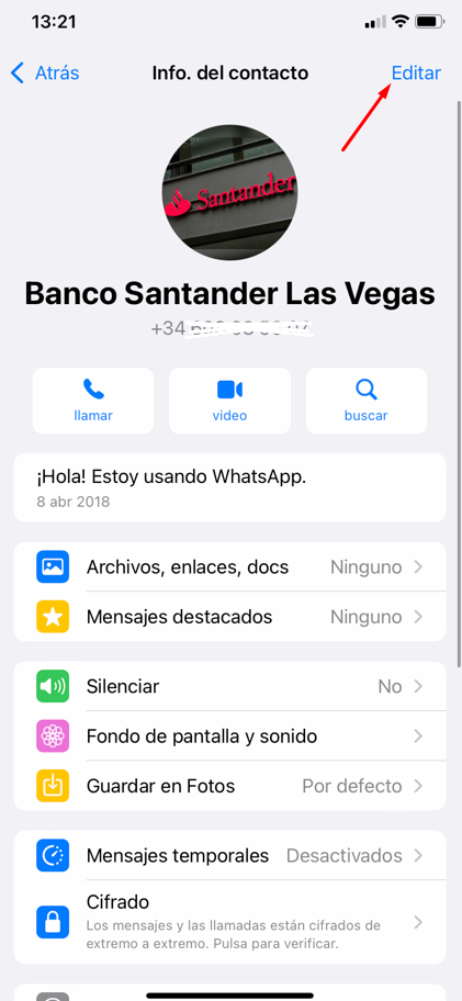 Una vez que te encuentres en la ficha del contacto a borrar, tendrás que pulsar sobre Editar, botón que encontrarás en la parte superior derecha de la pantalla: