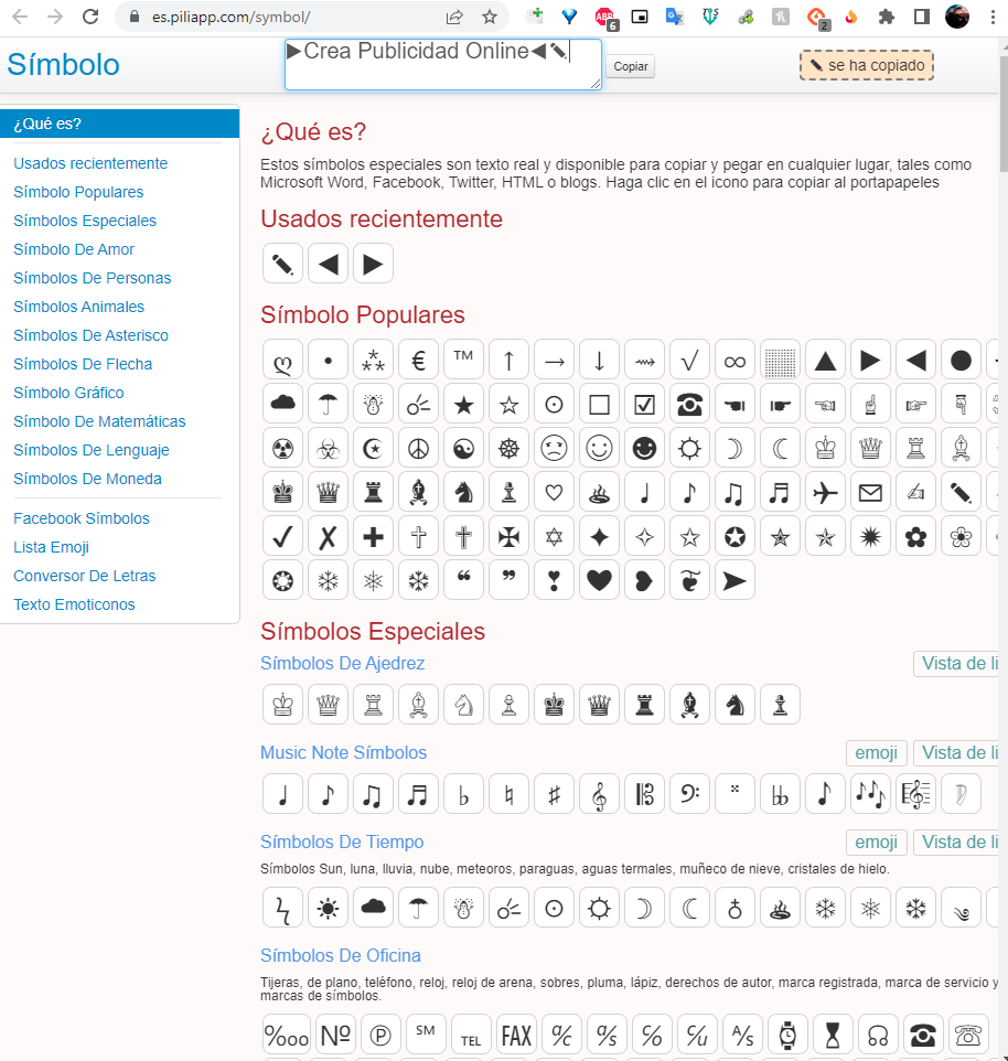 En este caso, una vez en la web solo tenemos que ir pulsando sobre los símbolos que queramos y nos irán apareciendo en la parte superior, para una vez añadidos los deseados pulsar sobre Copiar. Aquí puedes ver un ejemplo: