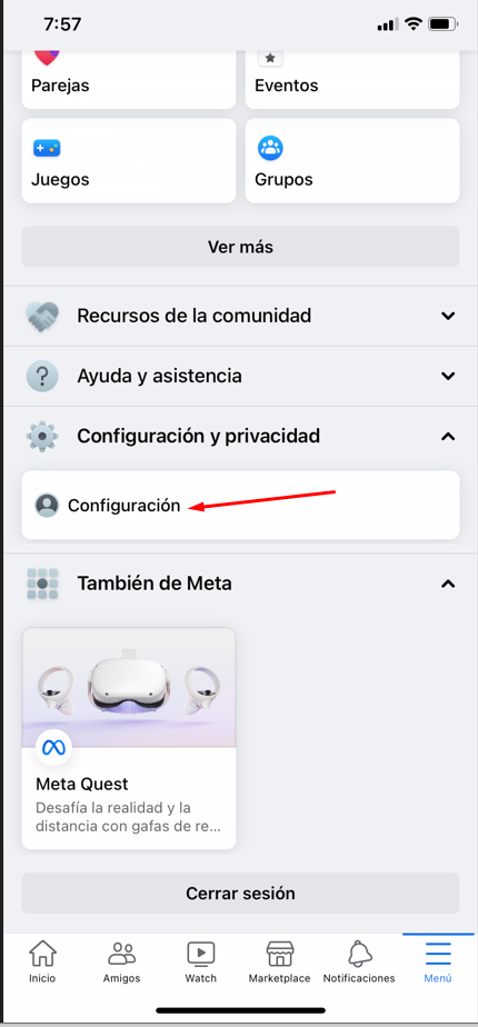 - En primer lugar debes acudir a tu aplicación de Facebook en el móvil para pulsar sobre el botón de las tres líneas horizontales, lo que hará que se te abra un apartado en el que tendrás que dirigirte a la sección Configuración y Privacidad, y en ella pulsar sobre Configuración, tal y como puedes ver en la siguiente imagen: