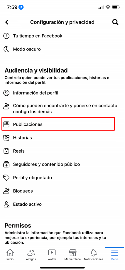 - A continuación tendrás que acudir hasta la sección de Audiencia y visibilidad, donde tendrás que pulsar en Publicaciones: