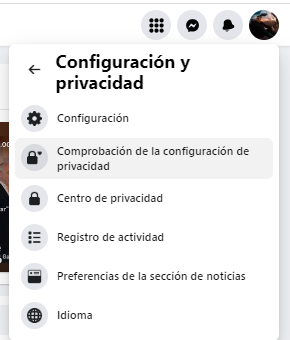 - En primer lugar acude a Facebook en tu navegador, y pulsa sobre tu foto de perfil, para luego pulsar en el botón emergente en Configuración y privacidad y luego en Configuración: