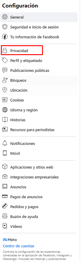 - Tras pulsar en Configuración, acudirás a una nueva ventana, en la que tendrás que pulsar, en el menú de la izquierda la opción Privacidad: