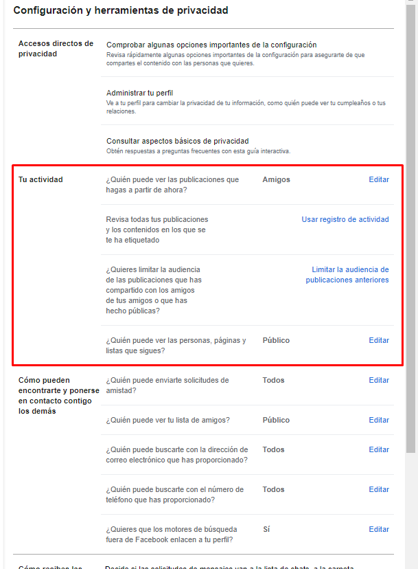 - En esta sección nos encontraremos con el apartado Tu actividad, desde donde podremos hacer los ajustes relativos a la privacidad y a compartir nuestras publicaciones de Facebook, para lo cual habrá que pulsar en Limitar la audiencia de publicaciones anteriores en la sección » ¿Quieres limitar la audiencia de las publicaciones que has compartido con los amigos de tus amigos o que has hecho públicas?», así como ocultando las publicaciones a quiénes nos interese.