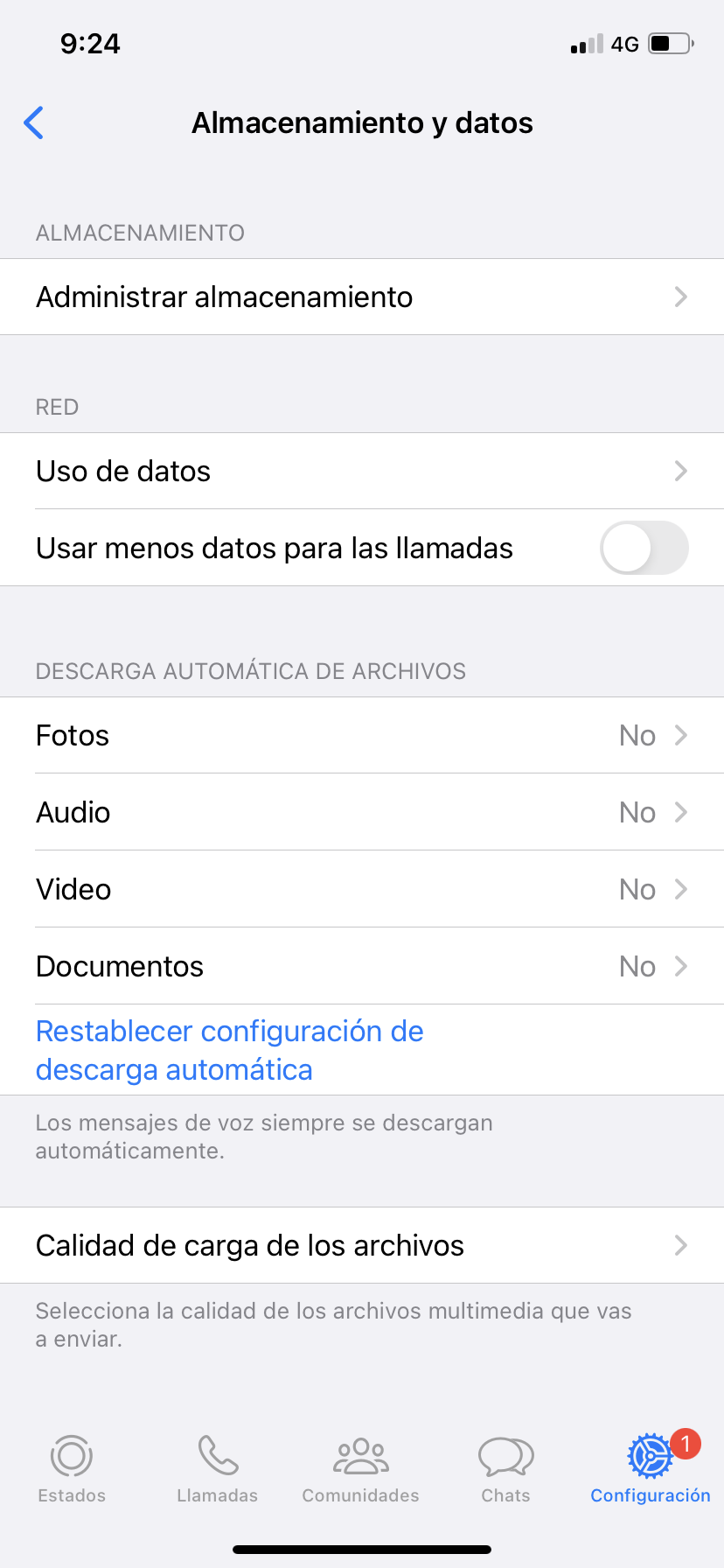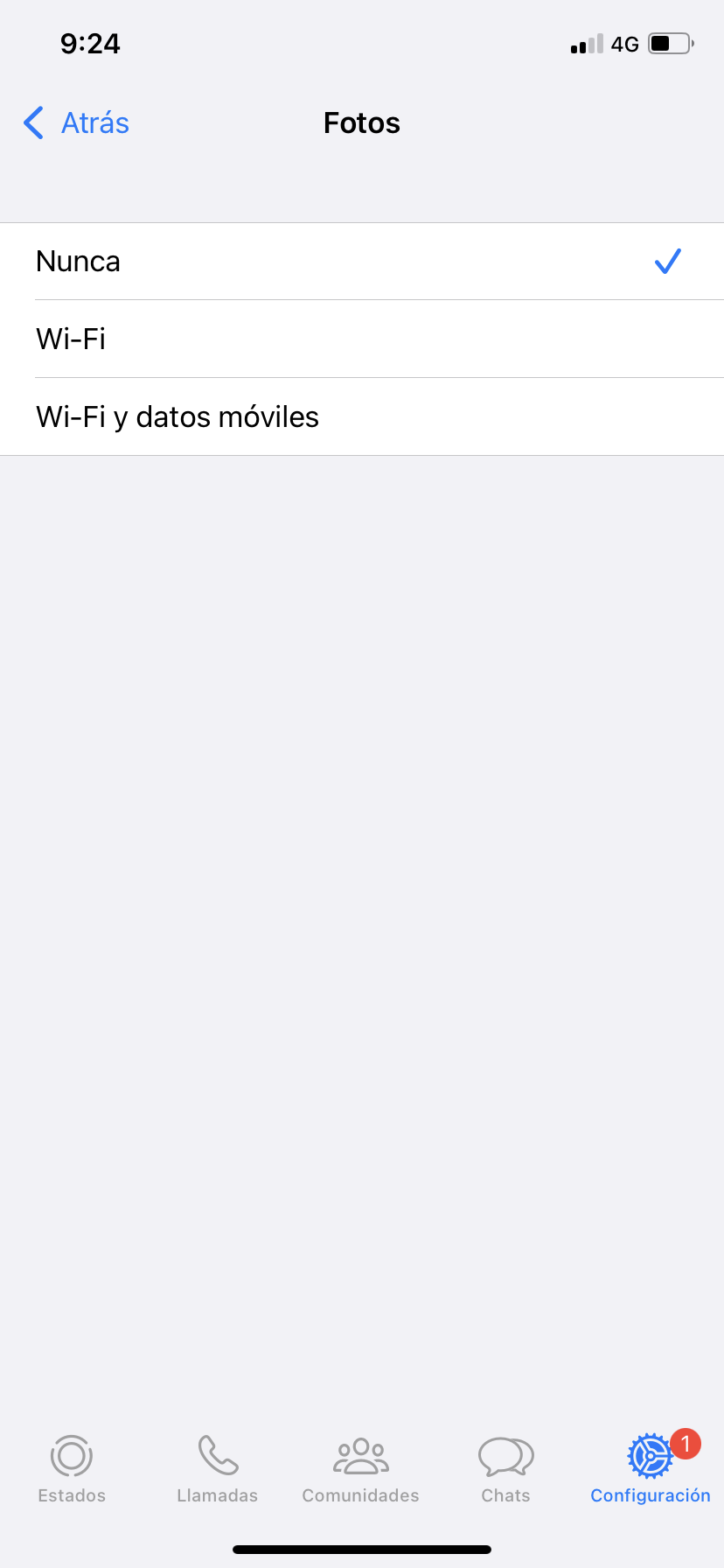 La única diferencia que tiene con respecto a Android, es que en este caso tendrás que ir a cada uno de los tipos de contenidos que se pueden descargar para elegir si quieres que se descarguen automáticamente con WiFi, con WiFi y Datos Móviles, o Nunca, que será la opción que tengamos que pulsar en el caso de que queramos saber cómo evitar que se descarguen fotos o vídeos en WhatsApp.