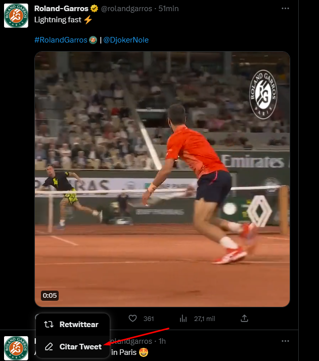 - En primer lugar tenemos que acceder a Twitter, donde localizaremos el Tweet que nos interesa fijar, caso en el que tendremos que retuitearlo, eligiendo en este caso la opción Citar tweet: