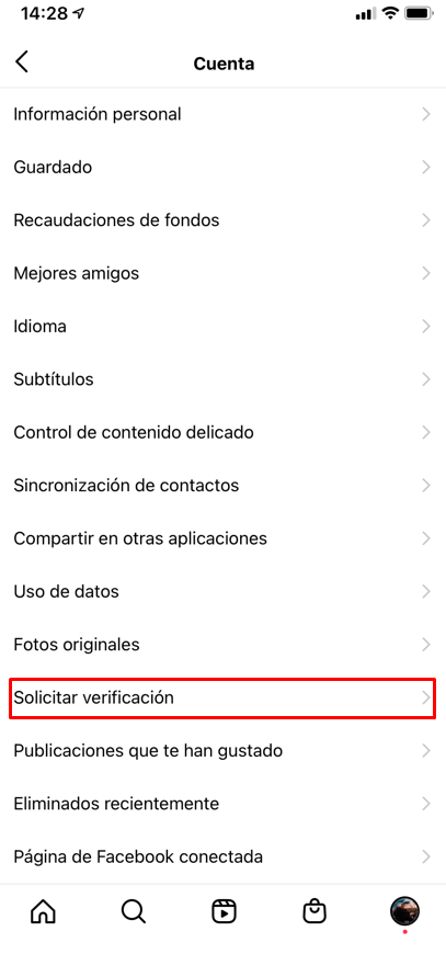 - Cuando te encuentres en Cuenta verás que entre todas las opciones disponibles se encuentra la de Solicitar verificación. Pulsa sobre ella: