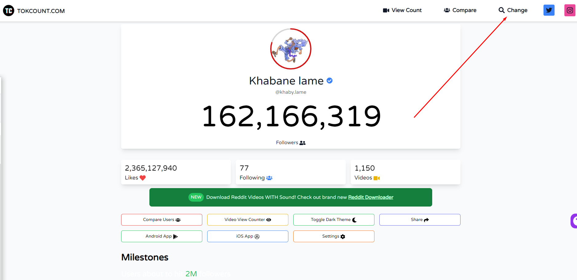 - Lo primero que debes hacer es acceder a la web TikTok Counter, para lo cual puedes pulsar AQUI. Una vez que lo hayas hecho, por defecto verás que aparece un perfil aleatorio, así como debajo de este otros perfiles promocionados.