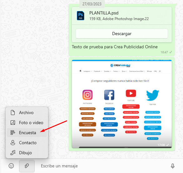 Una vez que se haya pulsado sobre el símbolo «+» o el clip en cuestión, aparecerá en pantalla un menú desplegable con diferentes opciones, entre ellas la de Encuesta que es sobre la que tenemos que pulsar: