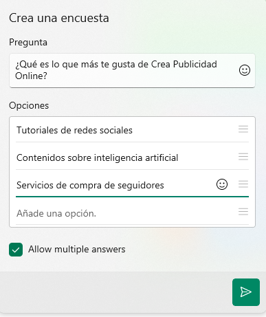 Tras pulsar sobre la opción Encuesta nos encontraremos con varios campos a rellenar, en los que podremos configurar la encuesta. Para ello solo habrá que colocar una pregunta y diferentes opciones de respuesta. Además, tenemos la posibilidad de activar/desactivar una casilla para permitir o no múltiples respuestas. Por defecto aparecerán dos respuestas pero puedes añadir más y cambiar tanto su posición como orden. Una vez lo tengas todo a tu gusto, solo tendrás que pulsar sobre el botón de enviar: