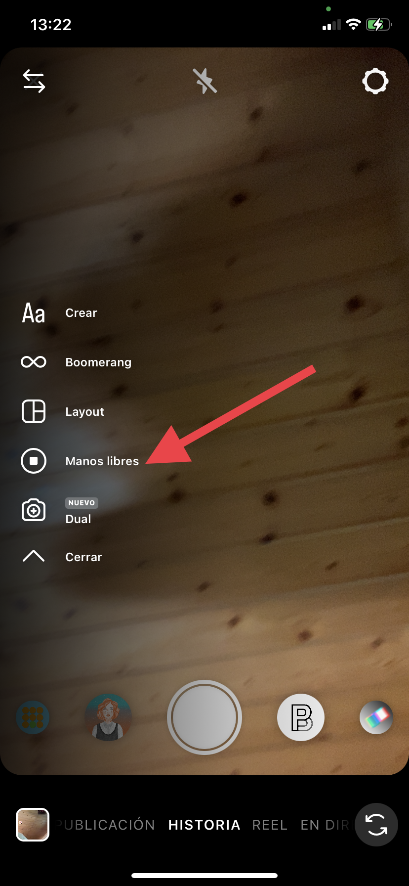 Una vez que vayas a la opción de historias, solo tendrás que pulsar sobre la flecha para que te aparezcan todas las opciones disponibles, y entre ellas te encontrarás Manos Libres, que será sobre la que tengas que pulsar, tal y como puedes ver en la siguiente imagen.