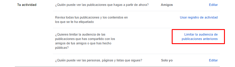 2. Luego tendrás que pulsar sobre Limitar la audiencia de publicaciones anteriores, que encontrarás en este apartado.
