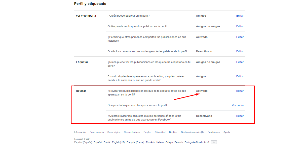 3. Tras pulsar sobre ella tendrás que dirigirte al apartado Revisar, donde encontrarás la opción «¿Revisar las publicaciones en las que se te etiquete antes de que aparezcan en tu perfil?», tal y como puedes ver en la siguiente imagen: