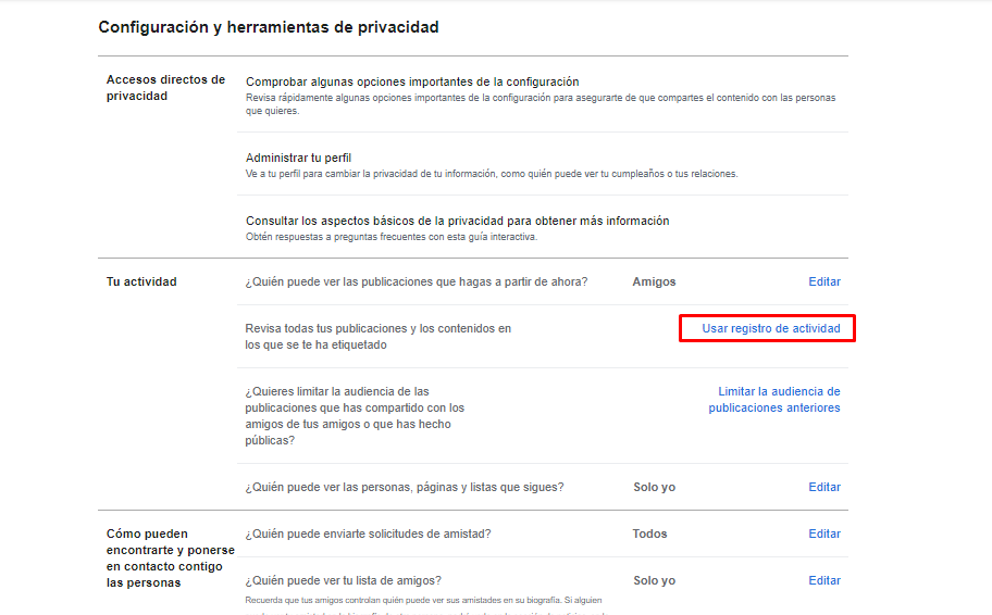 Desde este apartado podrás conocer todo el registro de actividad que has hecho además de saber quien ha interactuado o visto tus grupos, eventos, historias… Para ello solo tendrás que hacer lo siguiente: