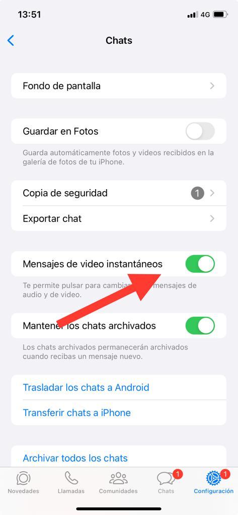 Una vez que te encuentres en ella, tendrás que pulsar en la opción Chats, lo que te llevará a la configuración de los mismos, donde podrás encontrar la opción Mensajes de vídeo instantáneos, que en tu caso estará desactivada y tendrás que pulsar el botón correspondiente para activarlo y que vuelva a funcionar: