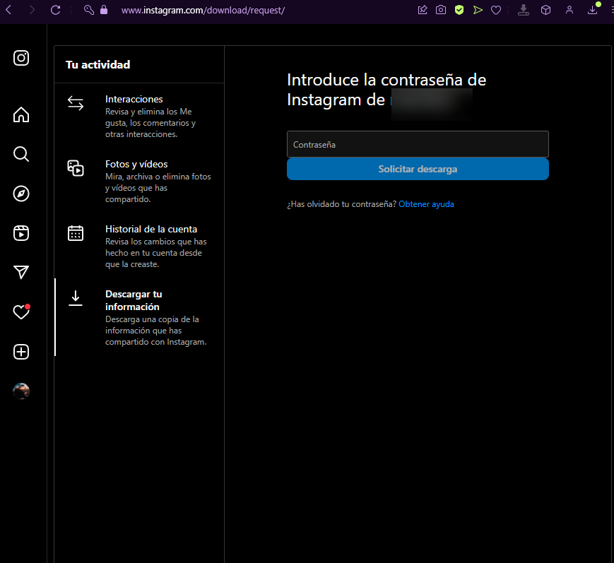 Una vez que hayas pulsado sobre Solicitar descarga te encontrarás con una siempre pantalla llamada «Obtén una copia de tu información».