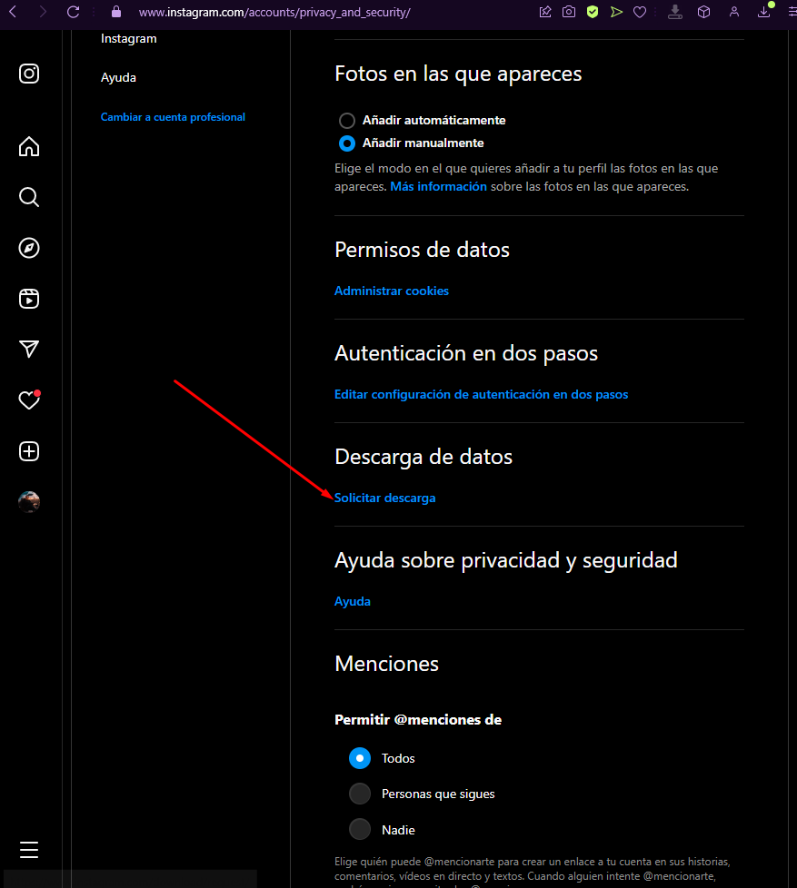Una vez que hayamos pulsado sobre esta opción nos encontramos con diferentes opciones entre las que elegir, debiendo desplazarnos hasta el apartado Privacidad y Seguridad, dentro del cual tendremos que fijarnos en el apartado Descarga de datos, y finalmente pulsar sobre la opción Solicitar descarga.