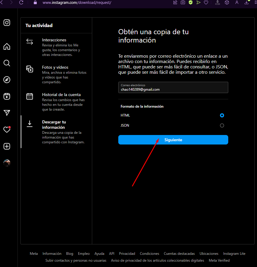 En ella tendremos que introducir nuestro correo electrónico (por defecto vendrá incluido el correo electrónico que tenemos vinculado a nuestra cuenta de Instagram), y seleccionaremos el formato de la información, ya sea HTML o JSON. Una vez elegido tendremos que pulsar sobre Siguiente, tal y como puedes ver en la siguiente imagen: