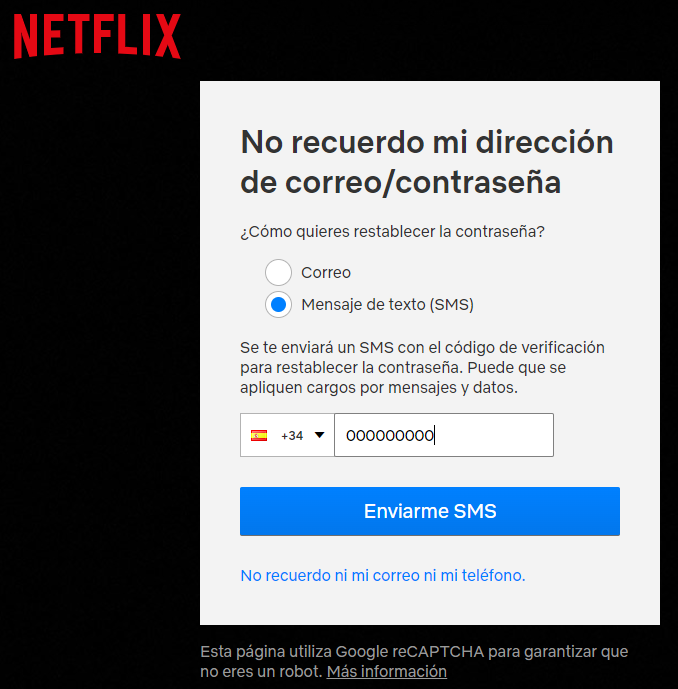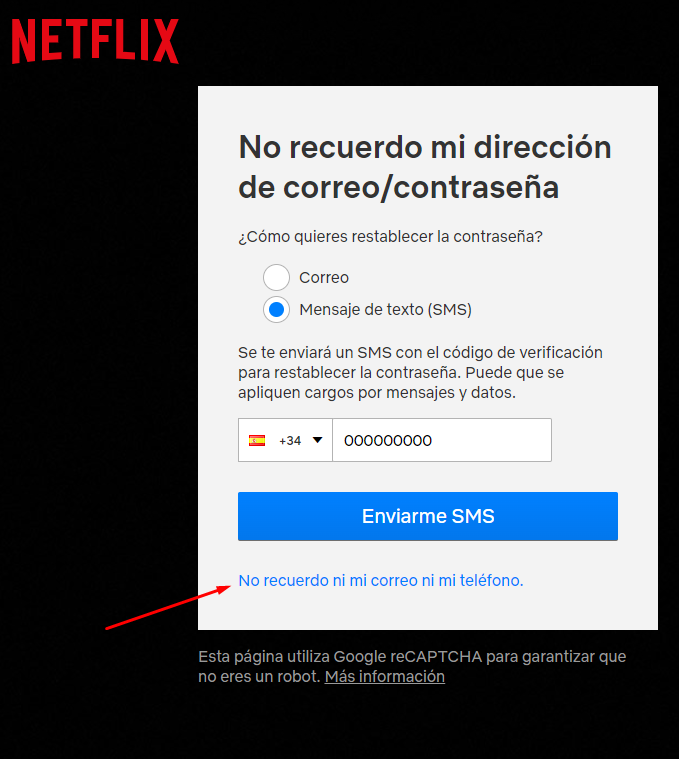 Si este método no te ha funcionado y quieres saber cómo recuperar cuenta o contraseña de Netflix, la otra opción es la de recuperar tu cuenta por medio de un mensaje de texto SMS.