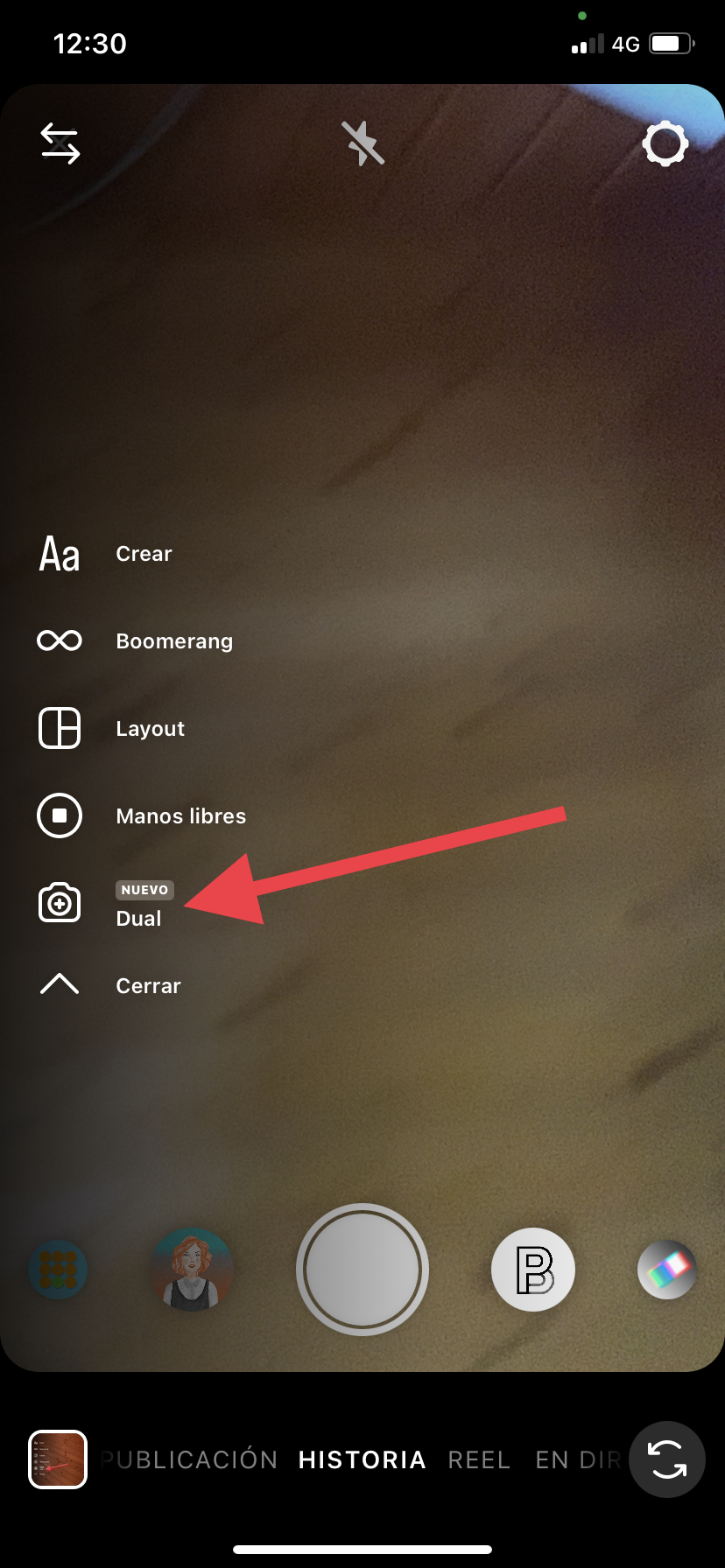 Una vez te encuentres en la historia de Instagram, debes pulsar sobre el botón de la flecha hacia abajo para que se desplieguen más opciones, momento en el que tendrás que pulsar sobre la opción Dual, tal y como puedes ver en la siguiente imagen:
