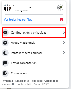 - En primer lugar acude a Facebook, donde tendrás que pulsar sobre tu imagen de perfil. Al hacerlo nos encontraremos con que nos aparecen diferentes opciones, debiendo pulsar en este caso sobre Configuración y privacidad, tal y como ves en esta imagen: