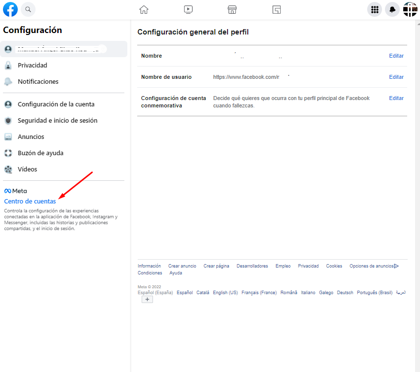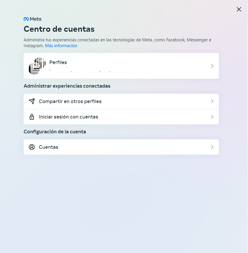 - Una vez accedido al Centro de cuentas de Meta nos encontraremos con la siguiente ventana: