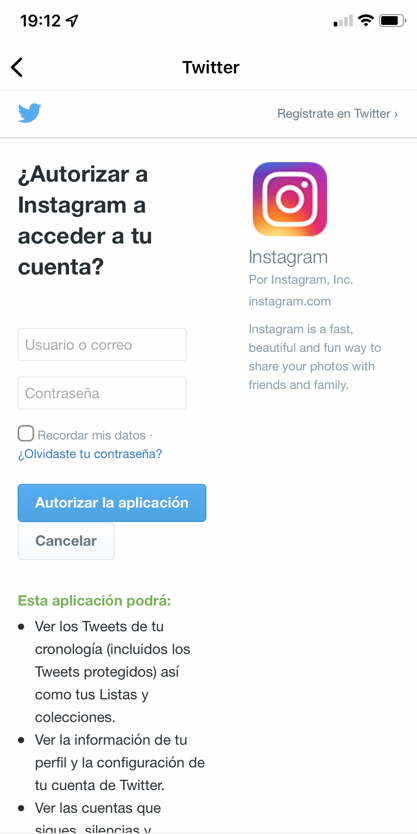 - Una vez que lo hayamos hecho nos encontraremos con que nos aparece la siguiente ventana, en la que solo tendremos que iniciar sesión con nuestros datos de Twitter. A partir de ese momento cada vez que subimos una publicación a Instagram tendremos la posibilidad de poder compartirla de una manera automática a través de Twitter.