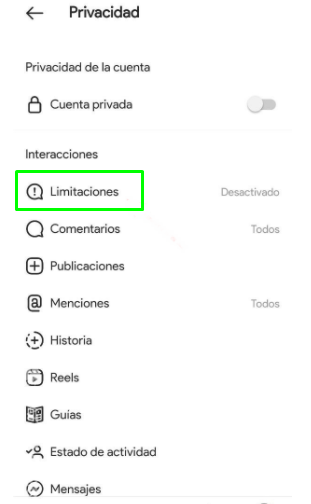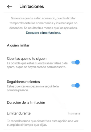 En ella te encontrarás por un lado con limitaciones de cuentas que no te siguen. Si Lo activas te encontrarás con que se bloquearán los mensajes y comentarios de cuentas que no te siguen, que podrían ser cuentas falsas que se hayan creado con la única finalidad de acosarte.